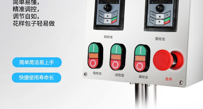 ◆ 本機(jī)采用雙絞龍送面、變頻無級(jí)調(diào)速,包子大小、出面出餡均可任意調(diào)節(jié),出面均勻、出面暢通、不傷面筋、不斷面筋,出餡系統(tǒng)優(yōu)點(diǎn):餡管不會(huì)掉餡,不會(huì)出現(xiàn)空包子,出餡速度快,壓力小,均勻,適合各種不同的餡料。解決了普通包子機(jī)菜餡走不穩(wěn)的問題。