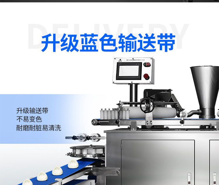 XZ-290A智能型卷面式包子機是一款以壓面方式成型面皮,卷面方式包餡,仿手工捏花的一款機型,它整合了原有的二道壓面、成型機、出餡機、切刀為一體,有操作方便、占地面積小等優(yōu)點。該機采用壓面成型面皮的方式,表面光潔,不傷面筋,不發(fā)熱,使產(chǎn)品口感滑順爽口,保持傳統(tǒng)手工工藝的風(fēng)味,本機采用自動控制系統(tǒng),品質(zhì)穩(wěn)定,壓面滾筒采用性能好的食品級材料UPE加工而成,且增大了滾簡直徑使得在壓面過程中面皮的精度更高,產(chǎn)品重量精度更高,規(guī)格,長度,大小,面皮的厚度皆可調(diào)整設(shè)定。