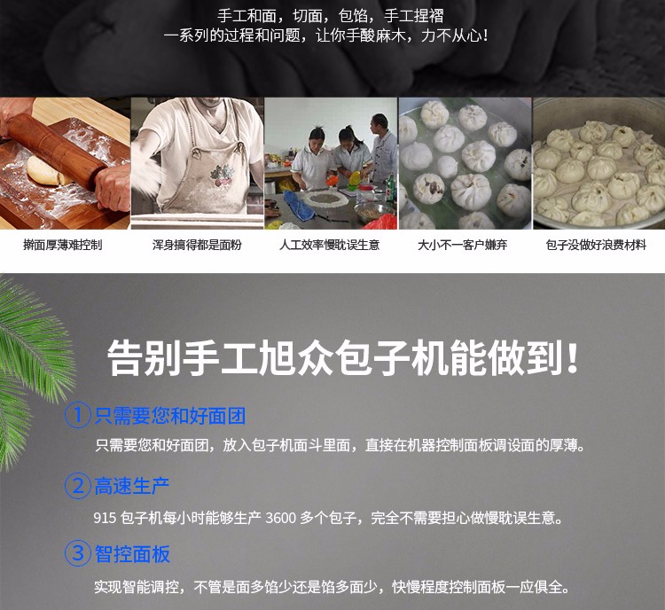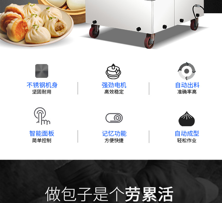 旭眾牌XZ-915全自動(dòng)包子機(jī)體積小重量輕,外殼及接觸食品部分均由不銹鋼制造,外觀精美耐用;采用三變頻無極變速調(diào)控,生產(chǎn)性能穩(wěn)定。設(shè)計(jì)先進(jìn),結(jié)構(gòu)簡(jiǎn)單,操作方便。包子機(jī)三大特色: