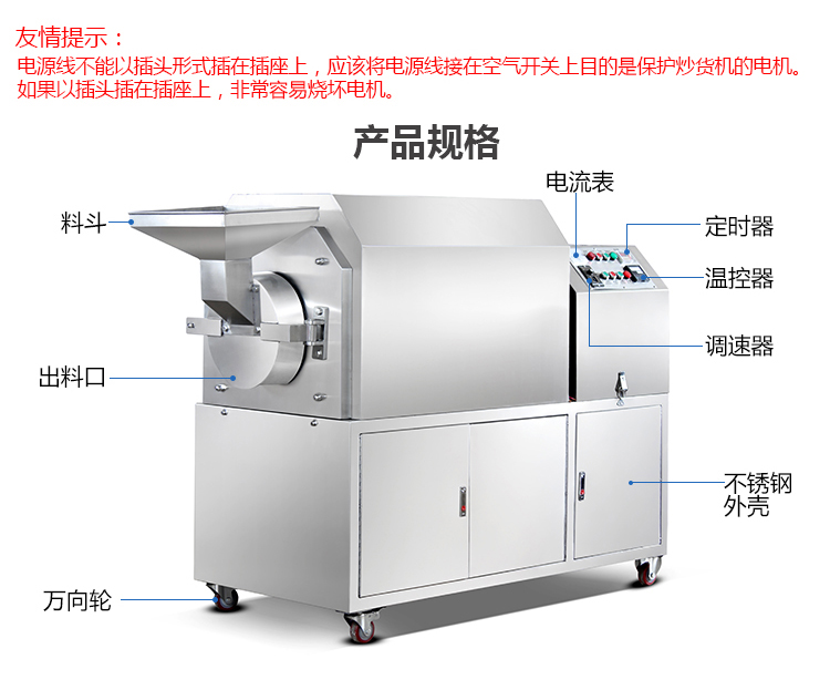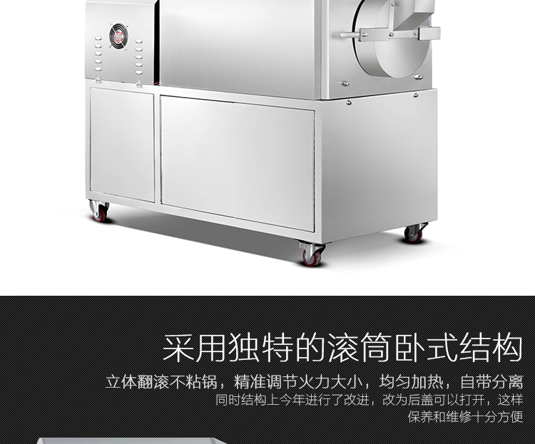 1.豪華炒貨機(jī)采用不銹鋼材質(zhì),獨特的滾筒臥式結(jié)構(gòu),加熱均勻,密封性好,燜炒效果好。同時結(jié)構(gòu)上今年進(jìn)行了改進(jìn),改為后蓋可以打開,這樣保養(yǎng)和維修十分方便,下料的地方增加漏斗,操作更方便!