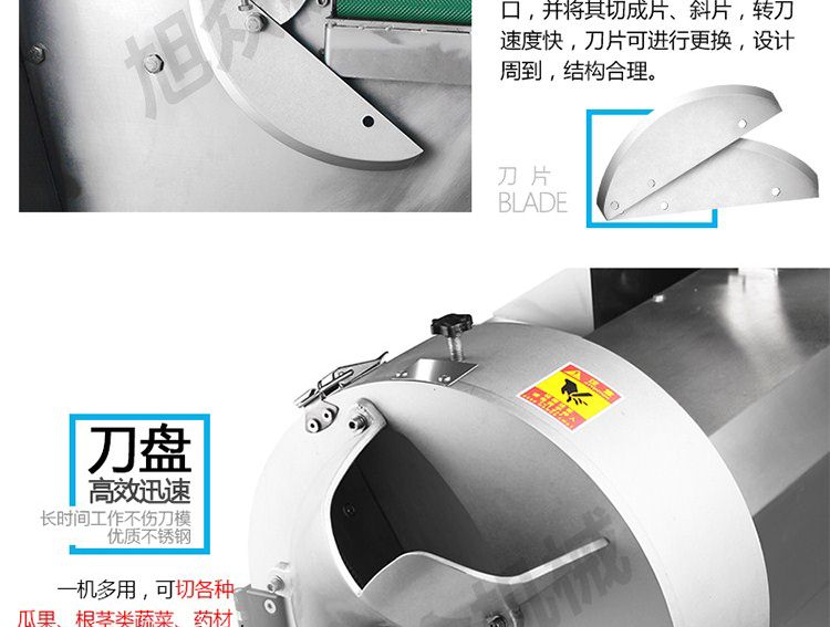 一機多用,可切葉菜及根莖類蔬菜,并可切片、絲、條、丁、段,碎等;根莖類,成品形狀:片、四角絲條、丁、斜片;葉菜類,切割尺寸:1-30mm可以調整。