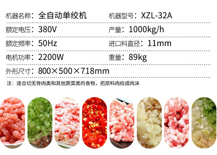 XZL-32A單絞機(jī)吸取同行之優(yōu)點(diǎn),改進(jìn)新型絞肉切肉機(jī)械,它能切豬肉、羊肉、牛肉、魚及其它各種肉類、所切肉片厚度適中切片效率高,是餐廳、賓館、酒樓、單位食堂等絞肉切肉的理想機(jī)械,該機(jī)外形獨(dú)特,操作方便,維修簡(jiǎn)單,工作效率高,在同行業(yè)中處領(lǐng)先地位,與食物接觸部分均采用不銹鋼制造符合食品衛(wèi)生標(biāo)準(zhǔn)。