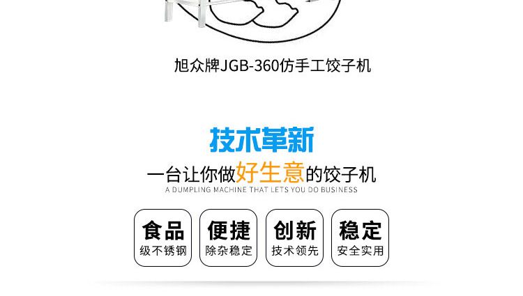 JGB系列餃子自動成型機,均適用于賓館、飯店、餐廳、團體食堂加工、幼兒園、速凍餃子生產(chǎn)等。