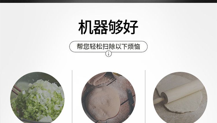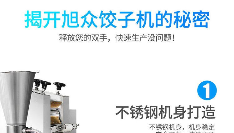 ?本機(jī)采用自動(dòng)軋制面皮后包制餃子的新工藝技術(shù),克服了舊式餃子機(jī)絞龍強(qiáng)力擠壓,使面團(tuán)面粉發(fā)熱、糊化、面制變硬、面胚失去筋度,而造成的餃子口感發(fā)硬,面皮較厚的缺陷。