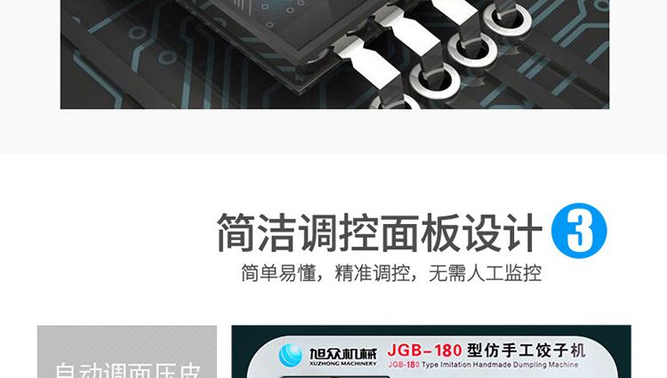 JGB-180仿手工餃子機(jī),先進(jìn)的自動(dòng)餃子生產(chǎn)設(shè)備,包括主動(dòng)壓皮部分、自動(dòng)供餡部分、自動(dòng)包合部分、自動(dòng)成品輸送部分,并且只要更換模具,就可制鍋貼等食品。適合食品速凍廠、飯店、廠礦學(xué)校食堂等制作包餡面制品單位使用。