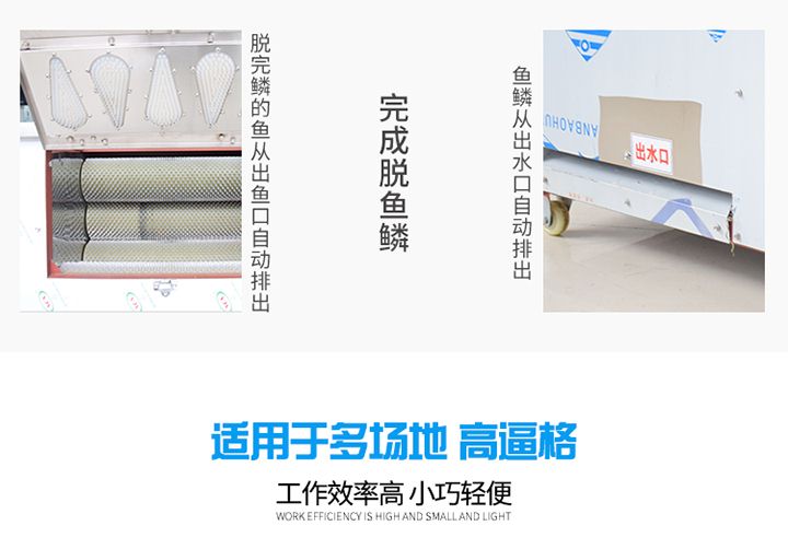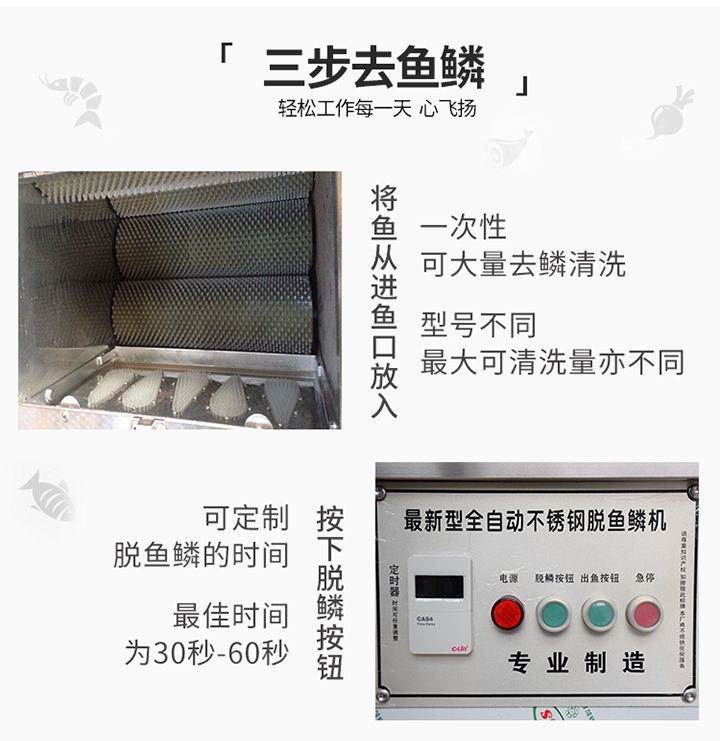 自動魚鱗機廣泛應(yīng)用于魚類銷售市場、飯店、魚類加工廠等等,本產(chǎn)品不會對魚頭、魚尾、魚鰭造成損傷。該機器利用旋轉(zhuǎn)效應(yīng),使魚在運動中去鱗,去鱗干凈,對魚的加工去鱗屬國內(nèi)外首創(chuàng),主要指標達到國際先進水平。