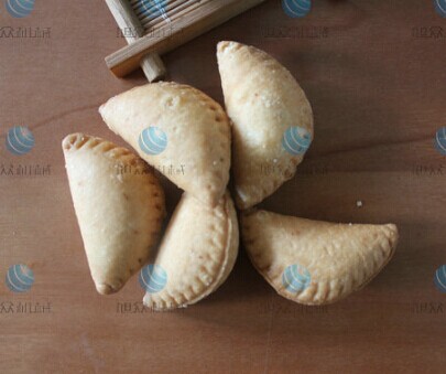 面粉用沸水燙成熟面,與糯米粉揉勻成粉團(tuán),搓條,摘?jiǎng)瞥善ぷ?。將?xì)豆沙餡,豬板油丁和糖分別包入皮子,對(duì)折成半月形餃子,放入油鍋,炸至金黃色撈起。
