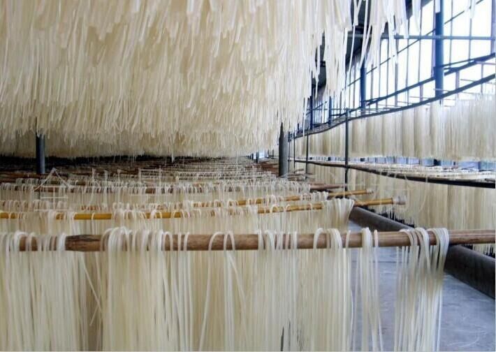 取大米60斤用凈水浸泡1-2小時(shí),用手一搓就爛就可磨成米漿(也可將大米浸泡30分鐘,然后陰干表面水分磨成米粉,再用米粉調(diào)成米漿)。筋力源0.8斤與40斤淀粉干拌勻,加入米漿和勻,補(bǔ)充水分至總量45斤,和面糊至自然攤開為準(zhǔn)。然后將和好的面糊放入自熟米線機(jī)擠絲、風(fēng)扇降溫,再放入涼棚熟化8-12小時(shí)、用水浸泡20-50分鐘,然后搓散、陰干表面水分、包裝、銷售。