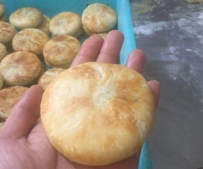 酥餅(Crispy Cakes ),系有特制的脂烙酥而得名。脂烙酥用上好的豬油,拌以適量蒸好的面粉,化油時加適量花椒、桂皮,油化后剔出已炸酥的花椒、桂皮,再和面成餡?;馃び孟阌秃兔妫坪萌霠t,用文火烘烤而成。其特點是皮酥,瓤有異香而不膩。