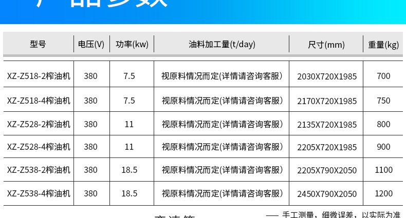 備注 | 每小時(shí)產(chǎn)量550斤物料(根據(jù)物料不一樣產(chǎn)量也不一樣),輔助設(shè)備配離心濾油機(jī)或正壓雙桶濾油機(jī)(需選配空壓機(jī))、炒貨機(jī)配XZ-C250或XZ-CD300 |
