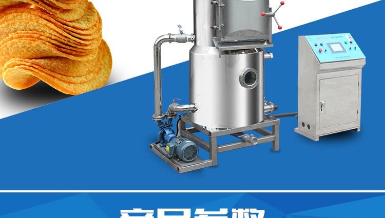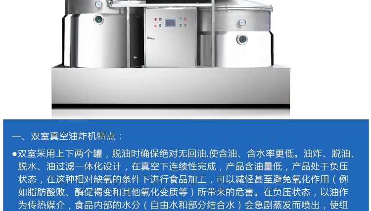 ●雙室采用上下兩個罐,脫油時確保無回油,使含油、含水率低。油炸、脫油、脫水、油過濾一體化設計,在真空下連續(xù)性完成,產(chǎn)品含油量低,產(chǎn)品處于負壓狀態(tài),在這種相對缺氧的條件下進行食品加工,可以減輕甚至避免氧化作用(例如脂肪酸敗、酶促褐變和其他氧化變質(zhì)等)所帶來的危害。在負壓狀態(tài),以油作為傳熱媒介,食品內(nèi)部的水分(自由水和部分結(jié)合水)會急劇蒸發(fā)而噴出,使組織形成疏松多孔的結(jié)構(gòu)。
